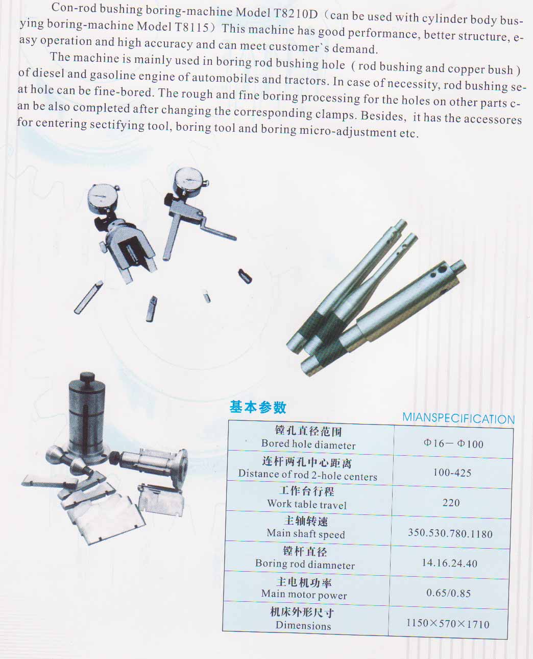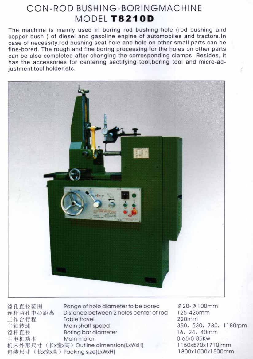 Con-rod bushing boring machine Model T8210D. Can be sued with cylinder body bushing boring machine Model T8115. This machine has good performance, better structure easy operation and high accuracy. The machine is mainly used in boring rod bushing hole (rod bushing and copper bush) of diesel and gasoline engine of automobiles and tractors. In case of necessity, rod bushing seat hole can be fine bored. The rough and fine boring processing for the holes on other parts can be also