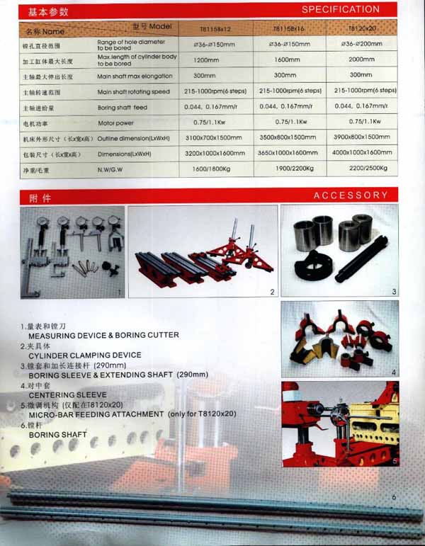 Model T8120x20 and T8115Bx16 cylinder body bushing boring machines are repairing machine tools with high efficiency and high precission. Which were developed in our factory. They can be used for boring master bushing and can bushing of engine & generator’s cylinder body in automobiles, tractors and ships etc. if necessary, the flywheel hub bore and bushing seat hole can be also finly bored. In order to reduce auxiliary manhours and labour intersity and guarantee machining quality, accessories for centering, sectifying tool, measuring inner diameter, boring rod bracket, tool holder to increase diameter, boring tool micro-adjuster and for distance tool sectifying device can be provided with the main machine.