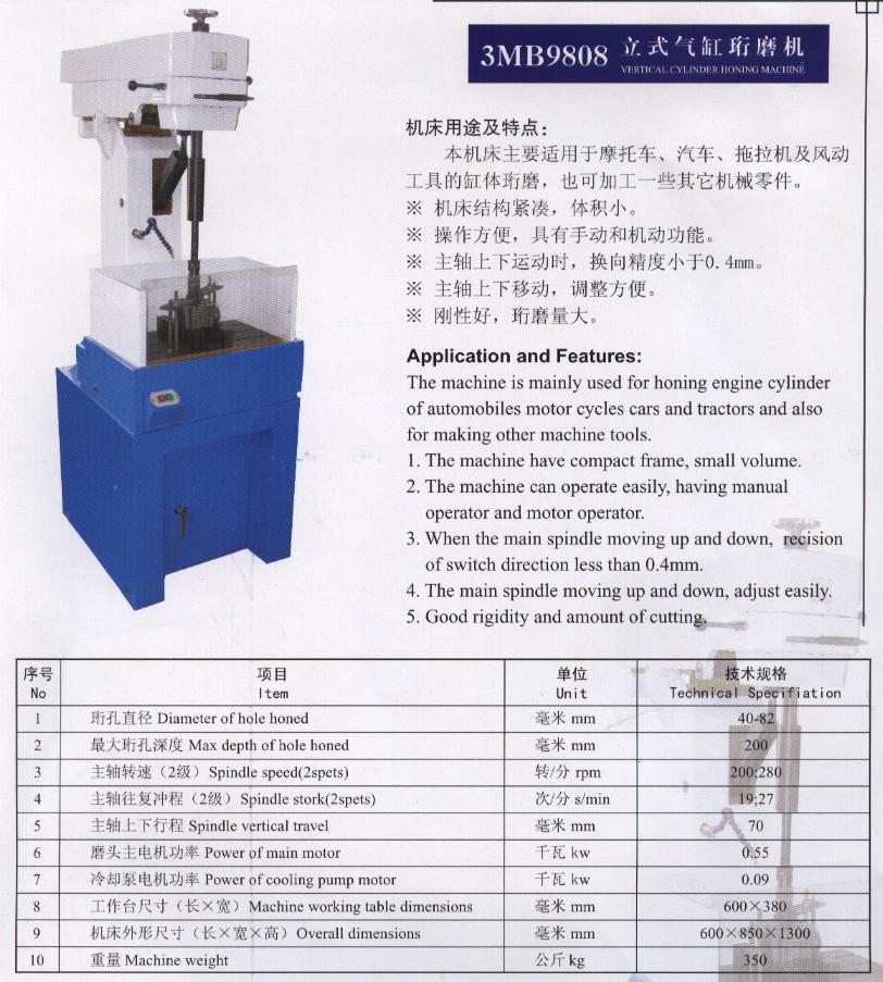 The machine is mainly used for honing engine cylinder of automobiles motor cycles cars and tractors and also for making other machine tools.